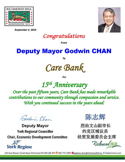 On September 3, 2023, Care Bank celebrated its 13th anniversary in Markham. This warm and loving celebration was held in the Chinese community branch of the Care Bank. The scene of the event was brightly lit and filled with a warm atmosphere. The heart-shaped design on the main wall brought attention to the words "Happy 13th anniversary Care Bank" and added colour to this special birthday. The celebration event was also an annual awards ceremony, which attracted the participation of guests and many volunteers including Mr. Peng from Toronto Online, Mr. Sun from Chinese Headlines, Mr. Jin from CC.News, Mr. Sun from Ruixiang Vision, and Mr. Wu from Huafengyun Art Troupe.